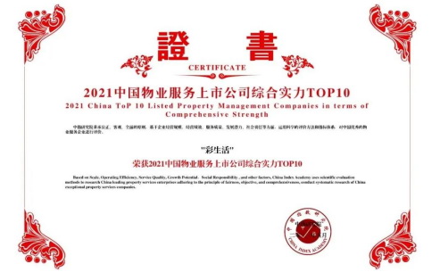 2021年4月22日,2021中國物業(yè)服務百強企業(yè)研究成果發(fā)布會上,彩生活服務集團榮獲“2021中國物業(yè)服務百強企業(yè)”第七名、“2021中國物業(yè)服務百強企業(yè)服務規(guī)?!钡谒拿ⅰ?021中國互聯網社區(qū)運營領先企業(yè)”、“2021中國物業(yè)科技賦能領先企業(yè)”多項大獎。