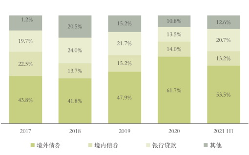 公司境內多個開發(fā)項目取得銀行開發(fā)貸,銀行貸款占總借款比例提高至20%;境外獲得集友銀行11億港元貸款額度,彩生活獲得1.5億美元銀團貸款額度。公司計劃到2021年底將美元債占總債務比例下降至50%以下,促使融資結構更加平衡,有效降低融資成本。